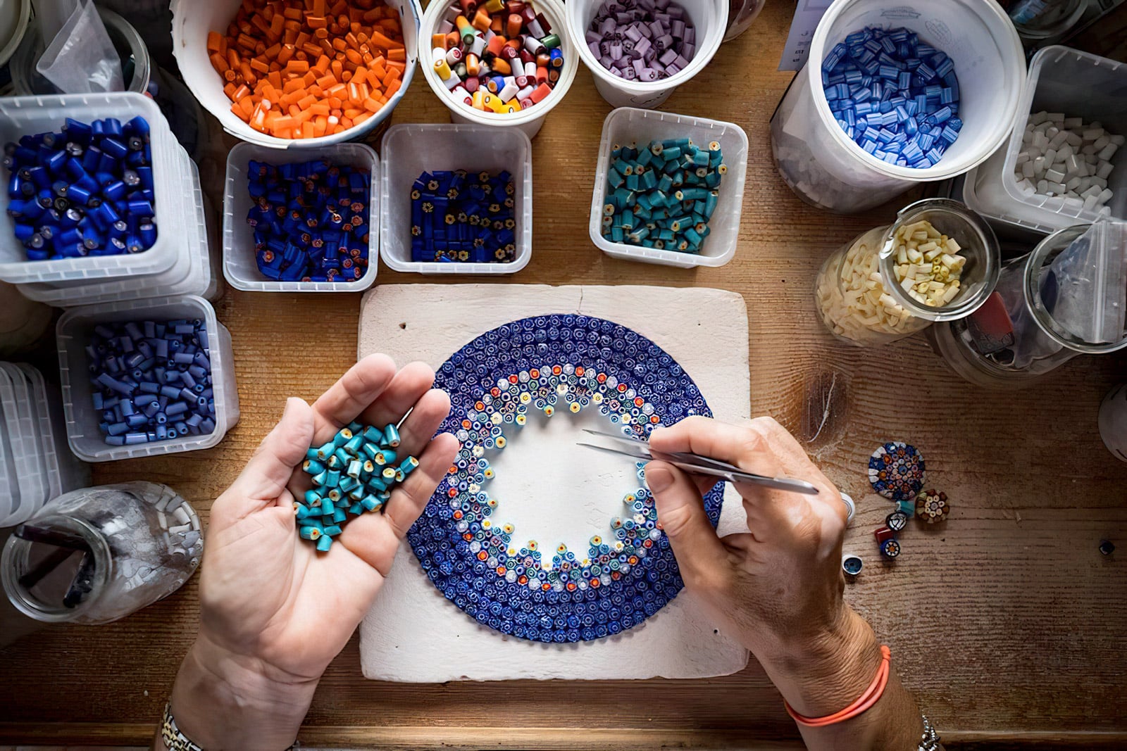 Contando su una appassionata esperienza, mani abili e sapienti accostano in uno speciale supporto refrattario innumerevoli segmenti di vetro colorato, modellandoli al calore del forno nella forma desiderata dando vita a pezzi unici come ciotole, piatti decorativi, pendenti, fermacarte, posaceneri, centrotavola, veri e propri oggetti d’arredo. Se si è alla ricerca di un pensiero originale, dall’alto contenuto artistico, le Murrine rappresentano senza dubbio la soluzione migliore anche per offrire la garanzia di un regalo sicuramente apprezzato.