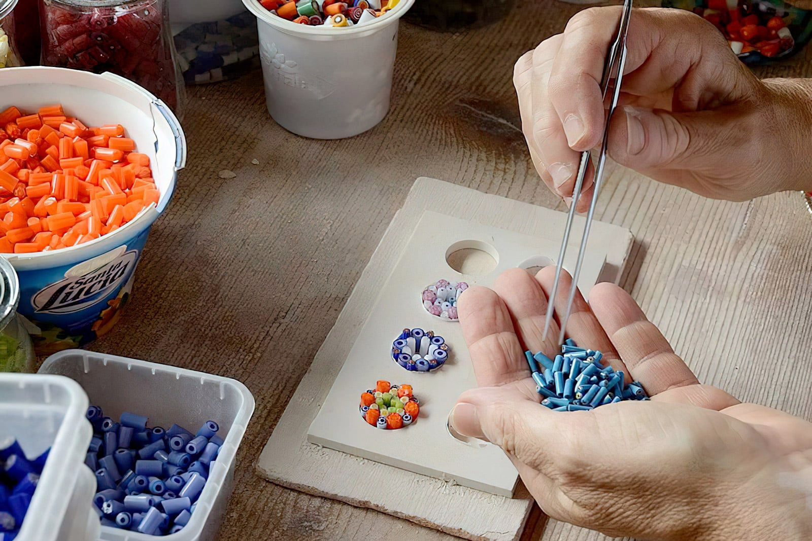 In questa tecnica l’abilità ed il buon gusto accostano in maniera opportuna segmenti policromi di canne di vetro millefiori o murrino (ossia canne che presentano in sezione colori e disegni diversi) che una volta fusi insieme assumono varie forme diventando, pendenti per ciondoli, bracciali, orecchini oppure ciotole che già nei secoli attorno alla nascita di Cristo venivano prodotti nelle fornaci alessandrine o romane.